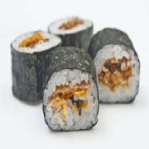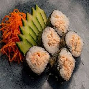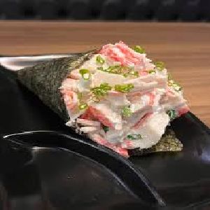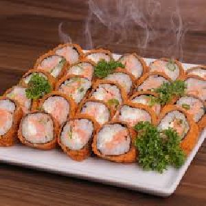 Enrolado com arroz por fora, alga, kani e cream cheese.