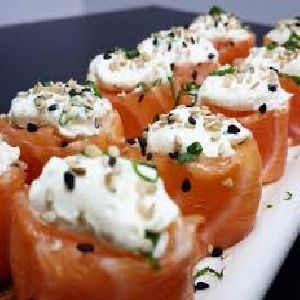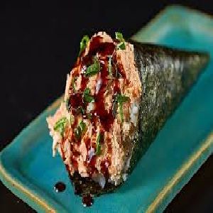 Enrolado com arroz por fora, alga, salmão grelhado e cream cheese.