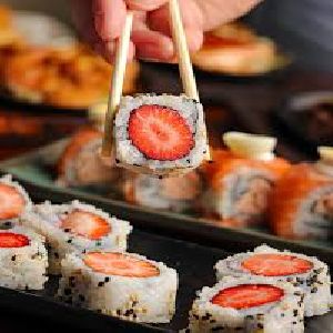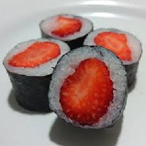 Enrolado com arroz por fora, alga, morango e cream cheese.