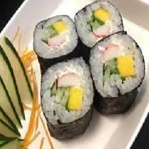 Alga, arroz, pepino, manga e kani.