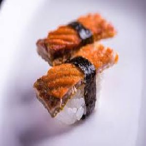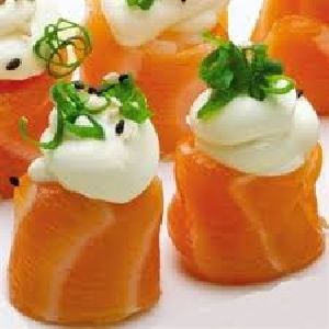 Enrolado com arroz por fora, alga, salmão grelhado e cream cheese.