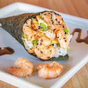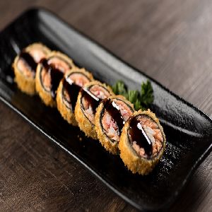 Enrolado com arroz por fora, alga, kani e cream cheese.